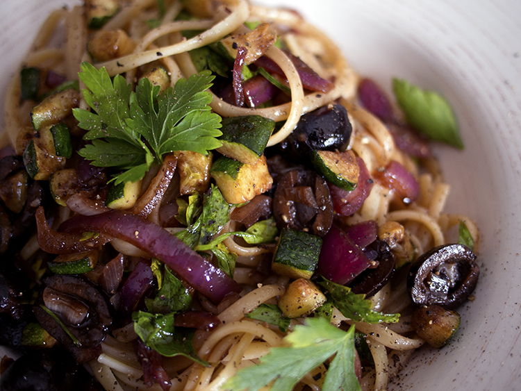 Linguine aux oignons rouges, aux olives et aux pépites de courgettes